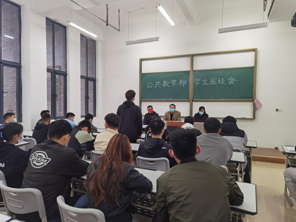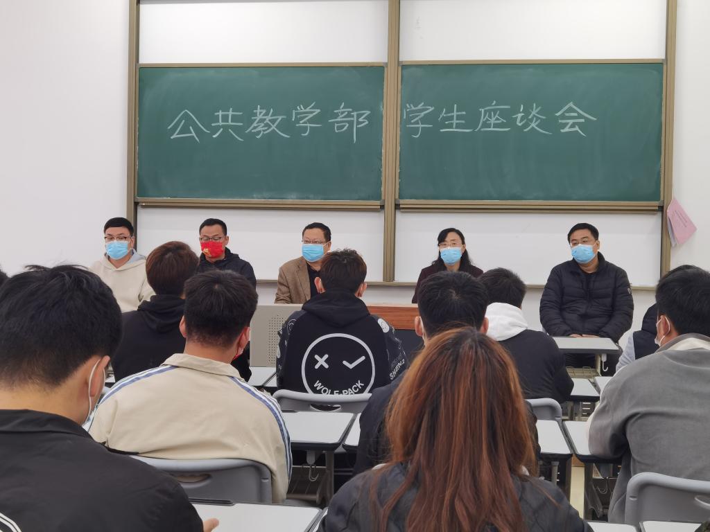4月1日上午,公共教學部在新校區七号教學樓召開學生座談會,傳達學院疫情防控要求,傾聽學生聲音,解決學生困難困惑。系部主任趙桂霞,黨總支書記孫富平、教學秘書劉楠,輔導員樊曉亮老師,以及各班級學生代表參加會議,會議由學beat365在线登录長李少傑主持。
