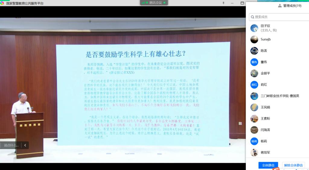 會上,中國科學院院士、清華大學物理系教授朱邦芬分别從“一流的人才不是教出來的,而是在營造的良好環境中“冒”出來的”、“給學生‘留白’,少點‘規定動作’,多點‘自選動作’”、“優秀學生的目标不僅是金牌,還要有勇攀科學高峰的使命感”、“成才需先成人”四個方面講授他對教育的思考。與會人員受益匪淺。