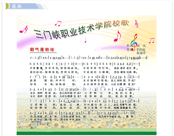 我院的校歌是一首熱情洋溢催人奮進的歌曲,歌曲處情于景,托物言志,其勢雄渾,撼人心魄,不僅具有時代精神,而且具有濃厚的人文情懷。歌曲情真意切,抒發了莘莘學子分發向上的豪情壯志。曲調激昂豪邁,熱情奔放,充滿了青春的氣息,是一首具有自身特點的校歌。
